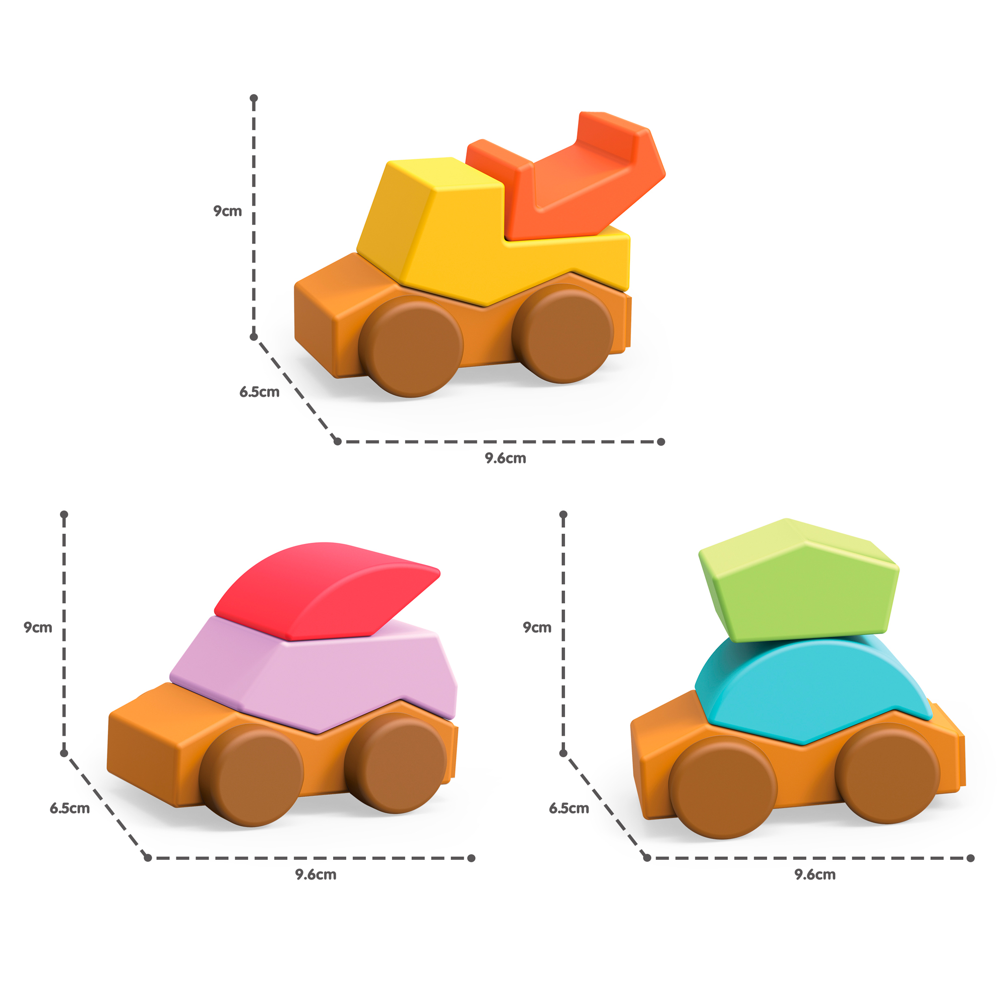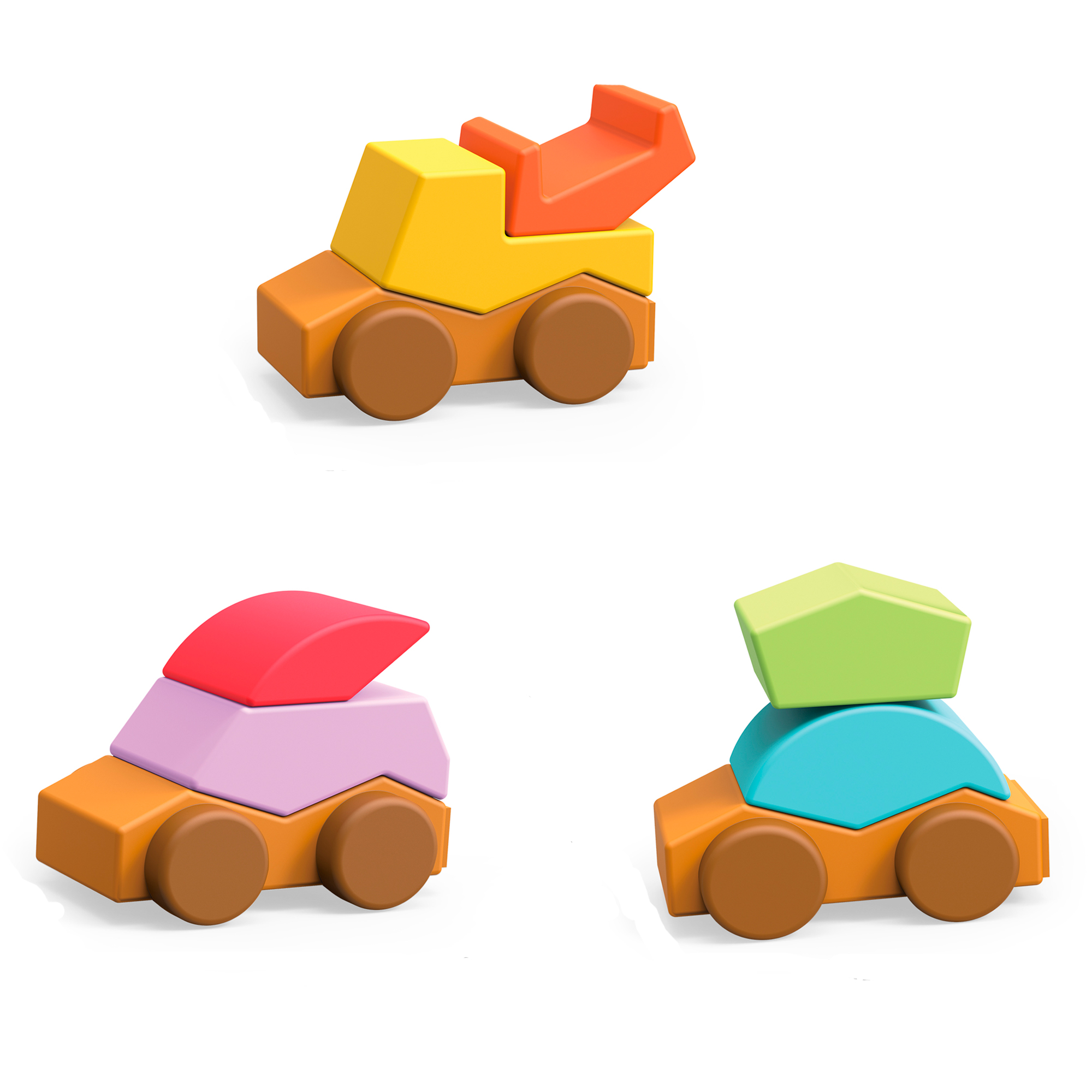 Juego de tres autos con texura y llamativos colores, cada auto está formado por bloques de diferentes formas y que se arman como puzzles.