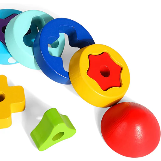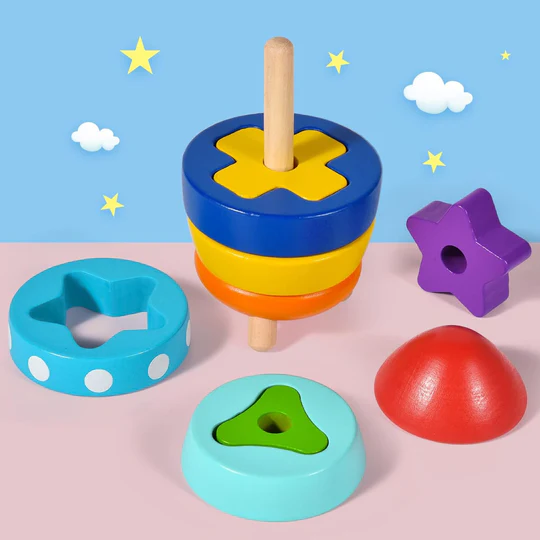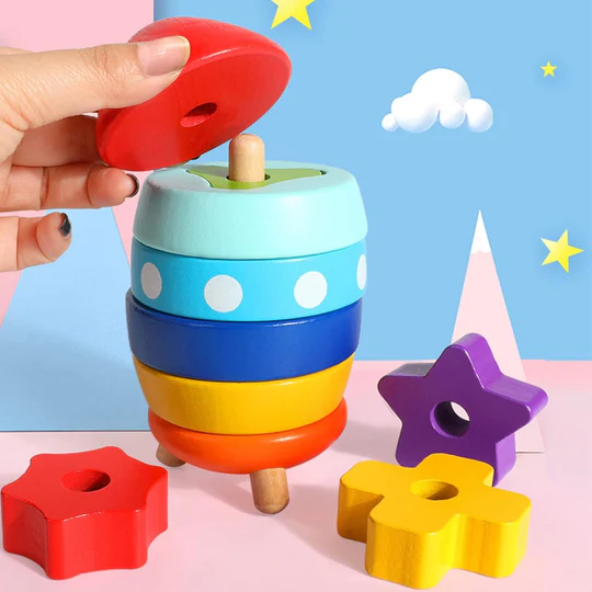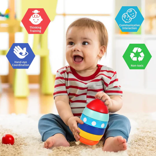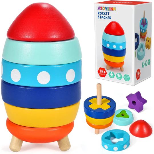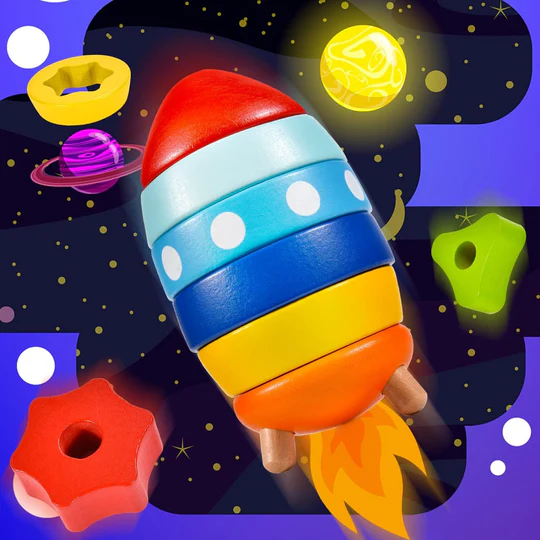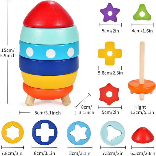 El cohete de madera apilable es un juguete didáctico diseñado para niños pequeños, consta de 10 piezas con diferente forma y color, para ser ubicadas en seis capas de abajo hacia arriba y dos capas desde el interior hacia el exterior. Promueve la coordinación viso-manual y la resolución de problemas.