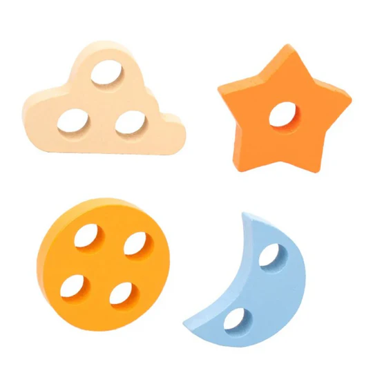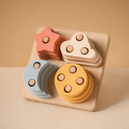Juguete de madera para apilar que cuenta con cuatro diseños de figuras geométricas diferentes, a la vez cada una en tres tamaños distintos y con un color llamativo. Desarrolla habilidades de clasificación, coordinación viso-manual, motricidad fina y resolución de problemas.