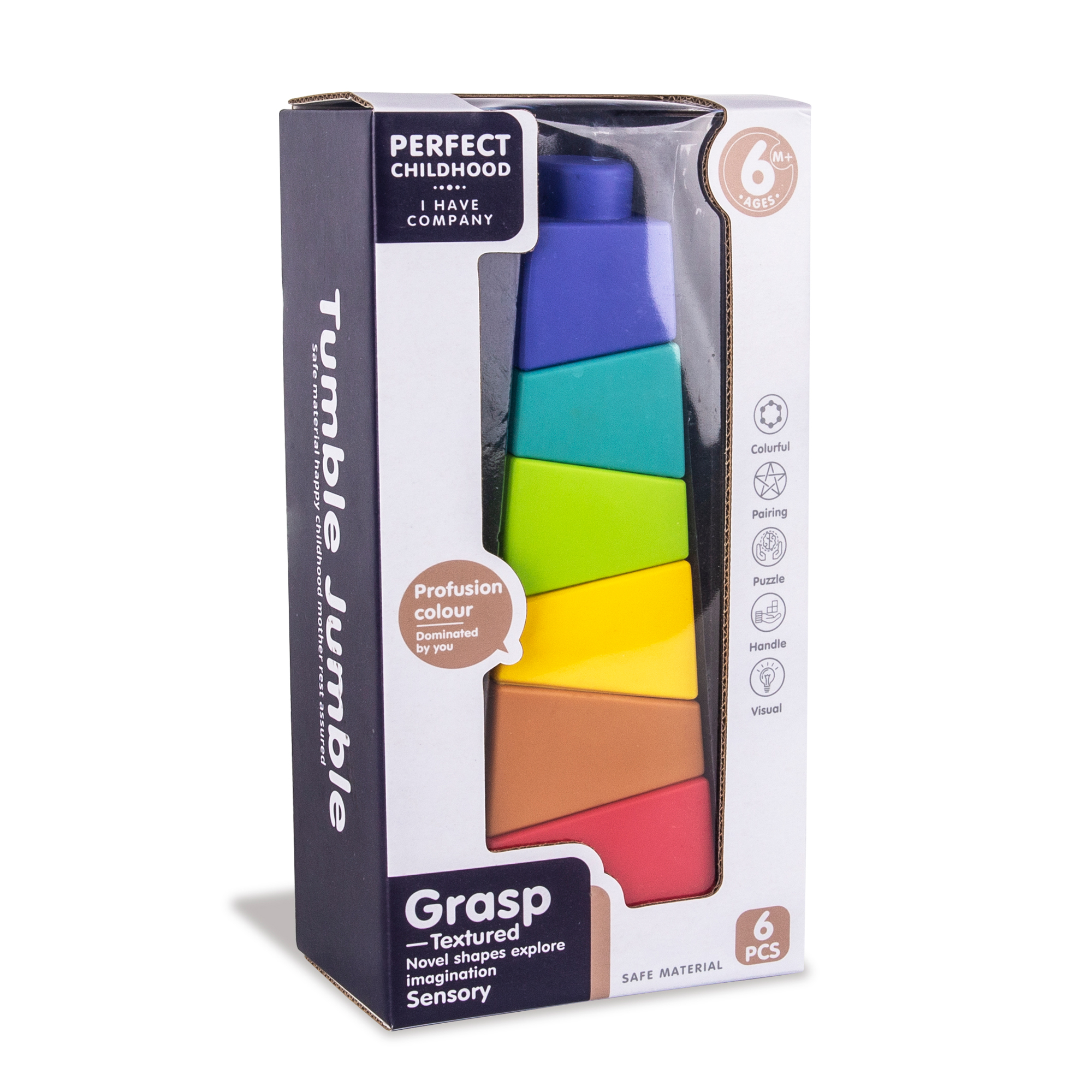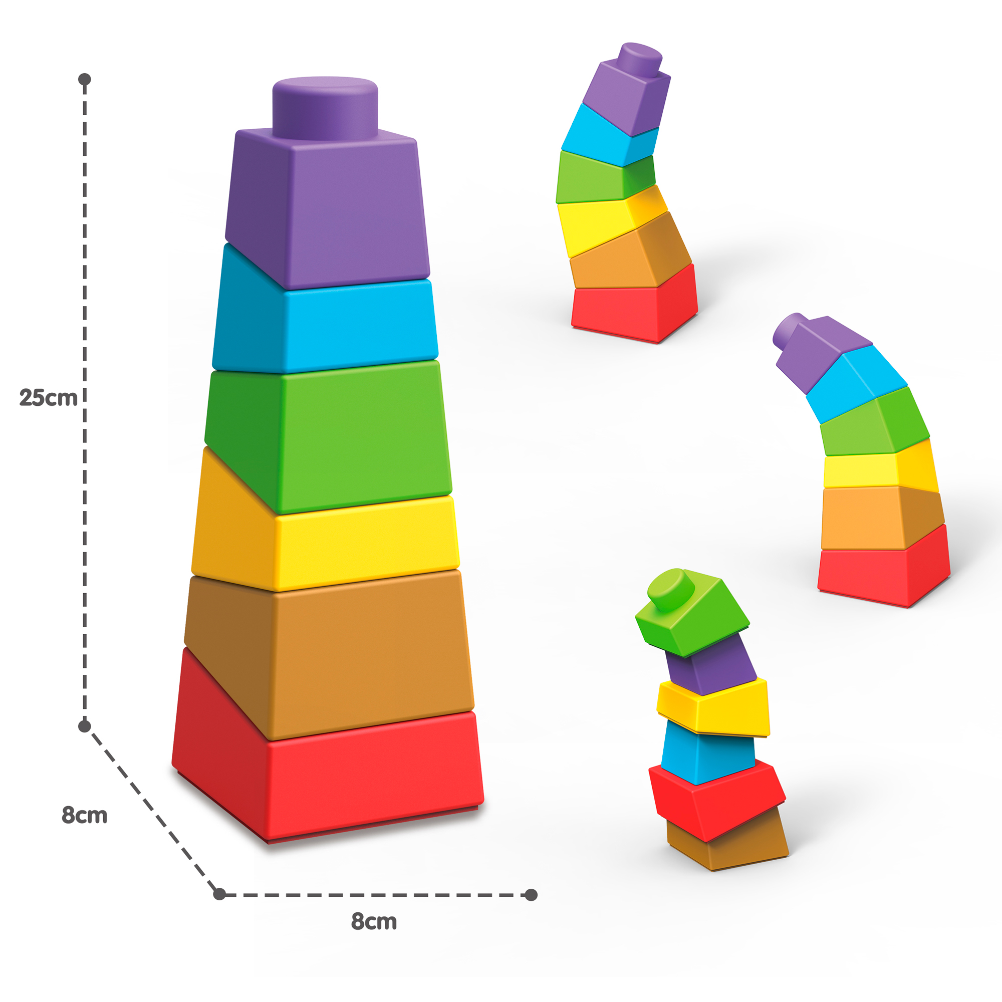 Torre de encaje de seis piezas con textura y llamativos colores. Cada pieza cuenta con una forma diferente permitiendo explorar diferentes figuras.