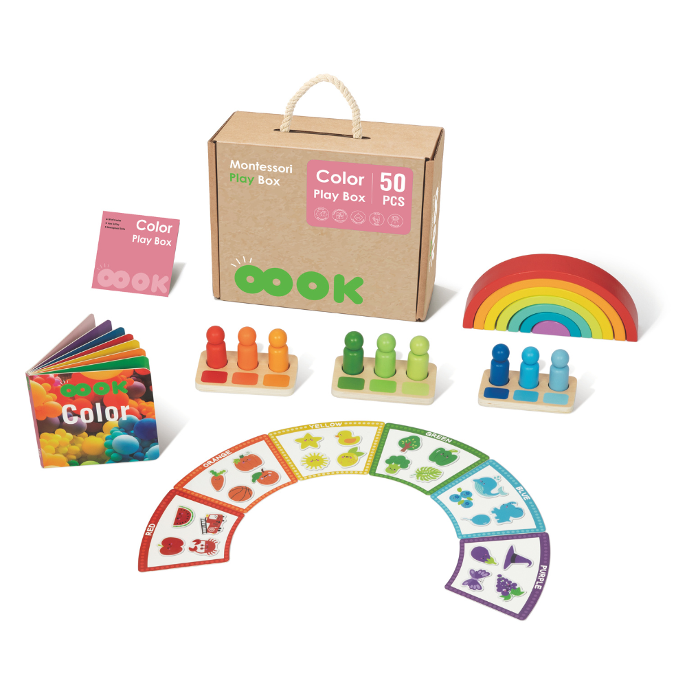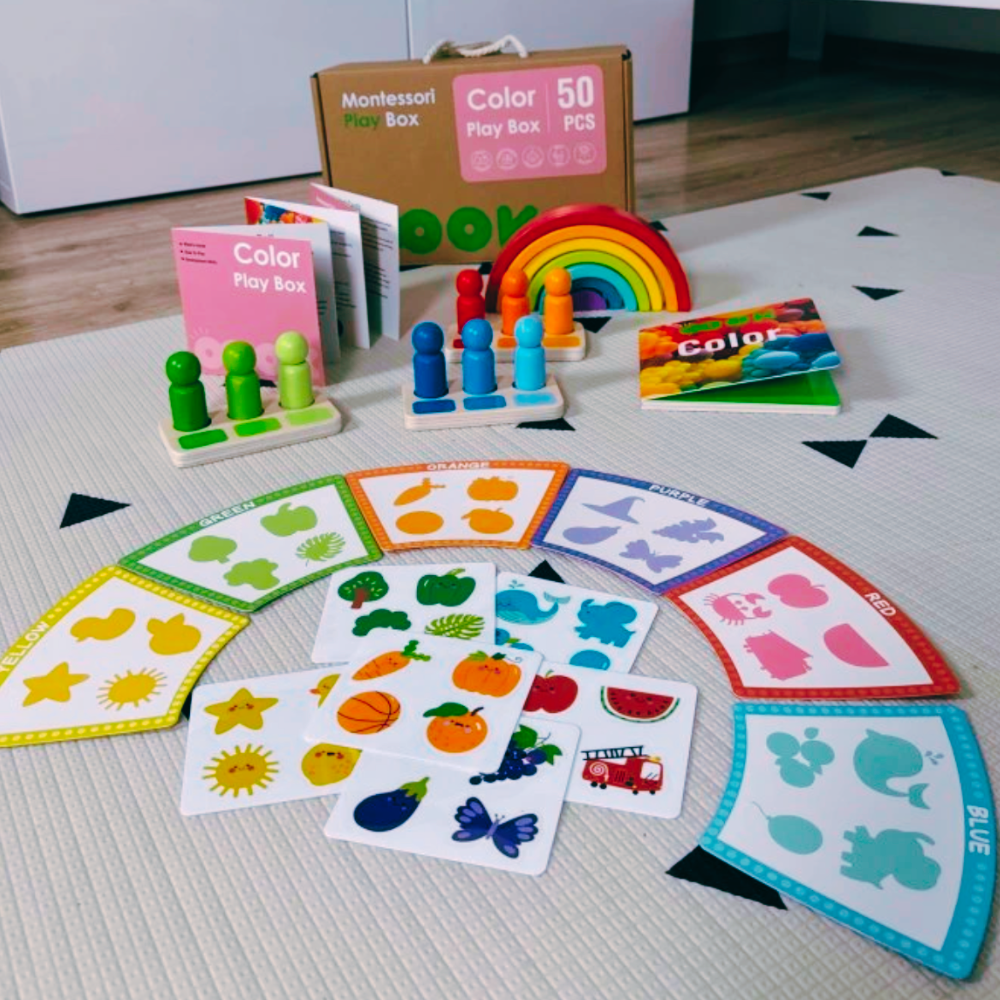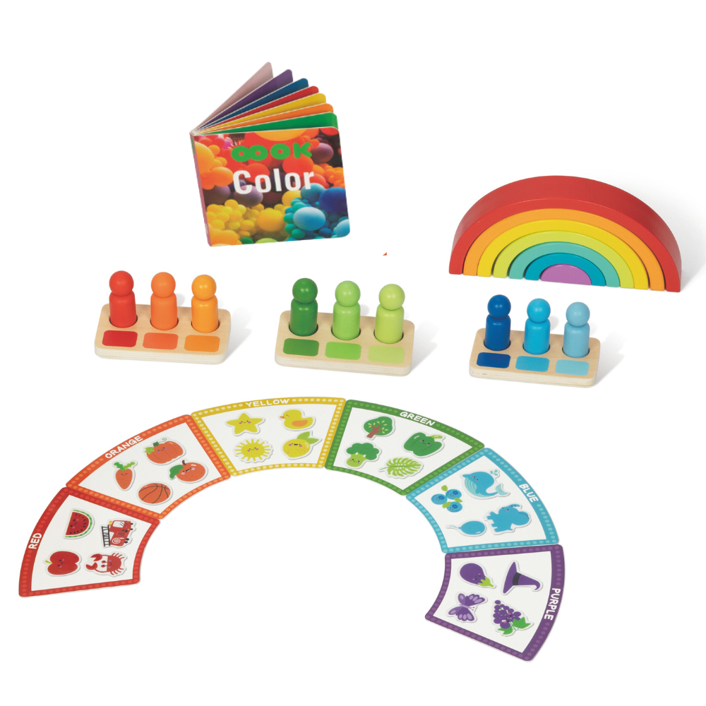 Esta hermosa caja didáctica de colores con 50 piezas incluye tres muñecos por color con paleta de degradado, un apilador arcoíris, tarjetas con sombras de colores y sus respectivos dibujos para hacer emparejamiento figura fondo y un libro ilustrado con varias imágenes de colores en nuestro entorno cotidiano. Este maravilloso set está diseñado para el desarrollo temprano del reconocimiento de colores.