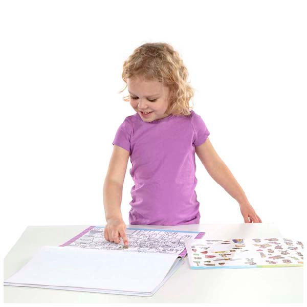 ¡Que entretenido! Este pad incluye un juego de busca y encuentra, figuras para pintar y un bloc de notas al mismo tiempo. Los niños podrán combinar más de 400 stickers con los objetos ocultos en las páginas y luego pintar las diferentes escenas para crear divertidos diseños. Las páginas de stickers están codificadas por colores para que los niños las hagan coincidir con las escenas.