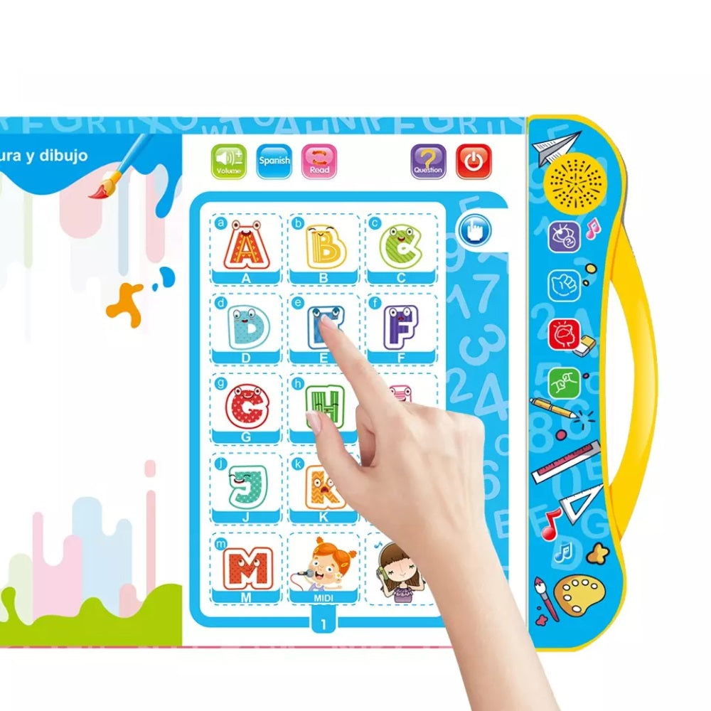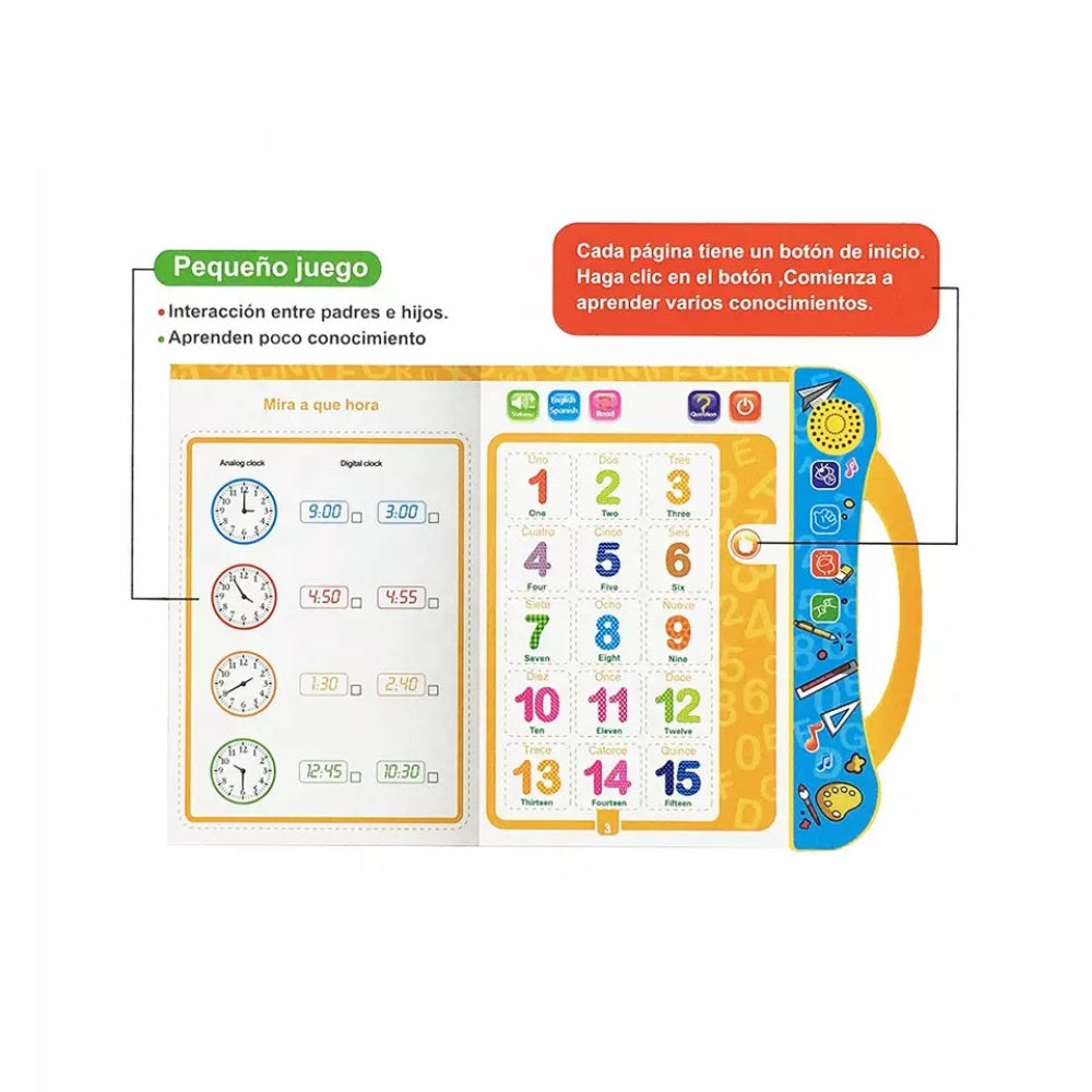 Libro didáctico interactivo con sonido en inglés y español donde los niños pueden explorar el abecedario, los colores, los animales, las frutas y verduras, los medios de transporte y los números. También cuenta con actividades de asociación, conteo, patrones y dibujo entre otras, que se pueden realizar una y otra vez, pues incluye un plumón borrable. Este libro está lleno de actividades educativas y entretenidas para que los niños aprendan mientras se divierten. Requiere 3 baterías AA no incluídas.